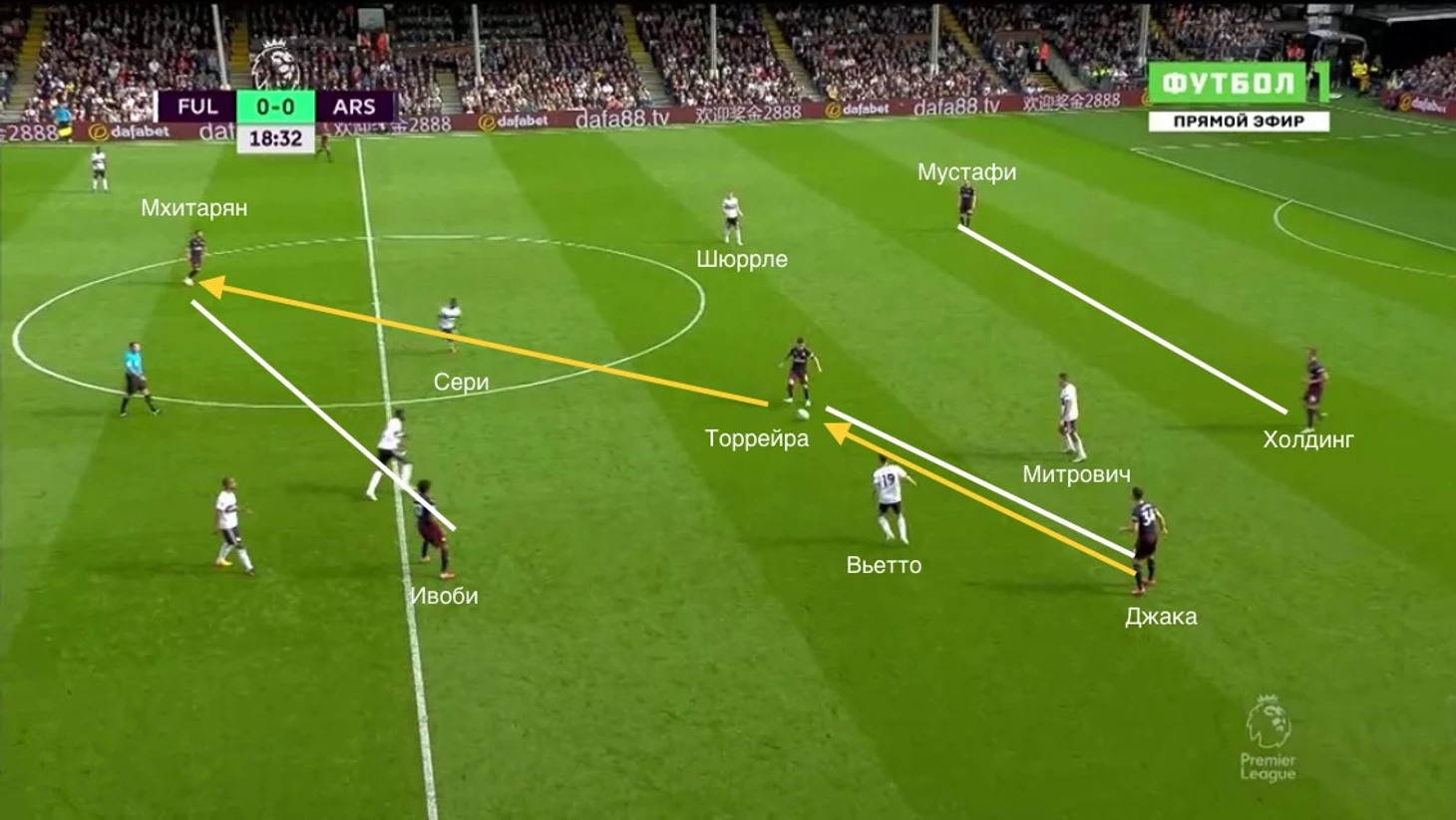 Мхитарян и Ивоби открываются под передачу Торрейры, уругваец отдает пас Мхитаряну, "Арсенал" выходит из-под прессинга.