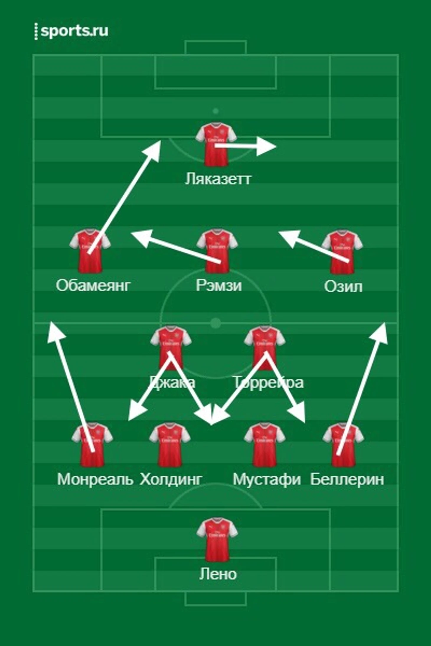 На примере состава в матче с "Уотфордом". Из-за расположения Обамеянга на фланге возникает ассиметрия перемещения игроков на свои позиции. Габонец уходит в пару к Ляказетту, тот, в свою очередь, смещается правее, часто вообще занимая правый флаг, откуда уходит в центр Месут Озил. Аарон Рэмзи, вместе с Озилом, занимают пространство под нападающими (по крайней мере, так должно быть, по факту же Рэмзи пристраивается к нападающим, а немец отдувается за двоих. Но об этом ниже).