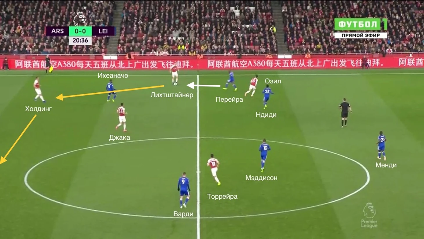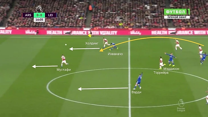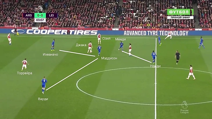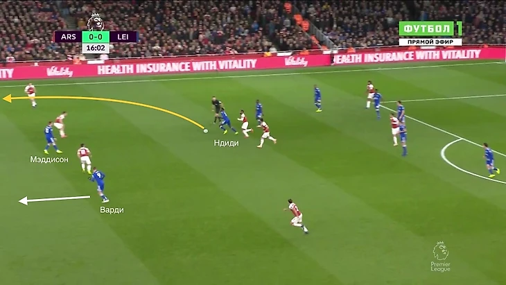 Также эта тройка игроков была нужна для использования уязвимости высокой обороны "Арсенала". Кто-то из нападающих Варди - Ихеаначо постоянно находился на одной лини с игроками обороны "Арсенала", готовый стремительно выбежать в контратаку, а Мэддисон отдавал передачи в разрез и поддерживал эти контратаки вторым темпом.