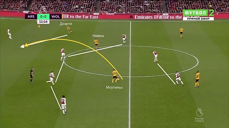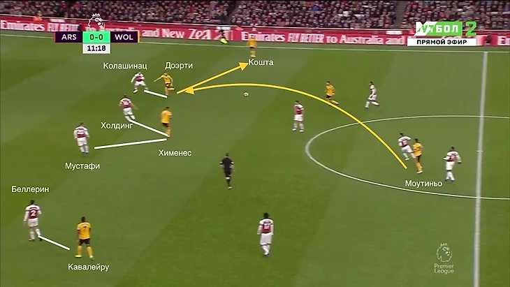 Возникает ситуация 4 в 4 в линии обороны "Арсенала", при этом Кошта свободен и получает мяч от принявшего передачу Моутиньо Доэрти.