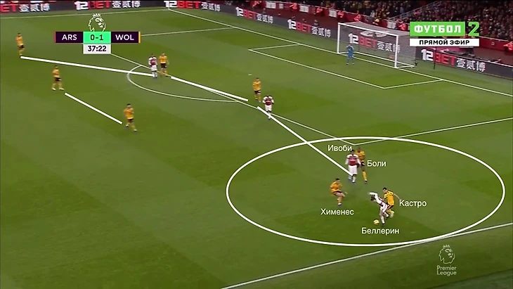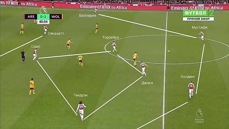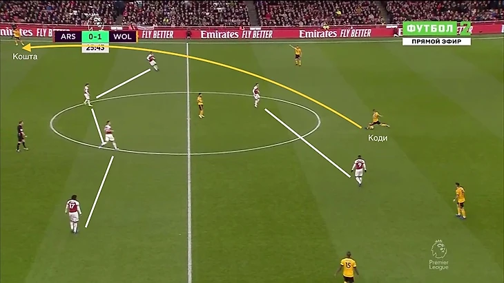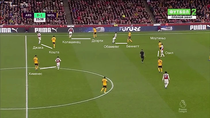 Атакующая игра "Арсенала" в бОльшей степени завязана на создании моментов с флангов. Очень часто это различные катбэки, прострелы и навесы. В этом матче скудный атакующий перфоманс команды во многом связан с тем, что "Вулверхэмптон" не позволял "Арсеналу" создавать численное преимущество на флангах и, тем самым, вынуждал команду Эмери развивать атаку через центр, с чем у нее возникают серьезные проблемы по ходу всего сезона. Схема 5-2-3 означала, что у "Вулверхэмптона" на фланг одновременно могут спокойно прийти три игрока: латераль, крайний центральный защитник и крайний нападающий или один из центральных полузащитников. У "Арсенала" же, в свою очередь, в этой зоне обычно находились два игрока: крайний полузащитник и крайний защитник, а также туда мог смещаться Месут Озил (как и в прошлых матчах чемпионата, но тогда это создавало численное преимущество, а в этом матче лишь уравнивало количество игроков). В любом случае на фланге получалась ситуация 2 в 3 или 3 в 3 в пользу "Вулверхэмптона", что в любом случае означает отсутствие преимущества в этих зонах и, как следствие, почти всех моментов в атаке после вскрытия флангов (то есть, большинства моментов "Арсенала"). В результате: у Колашинаца - 43 передачи назад и 32 вперед, разница -11, у Беллерина - 38 назад и 20 вперед, разница -18. Против "Ливерпуля" разница была -2 и -7 соответственно, против "Кристал Кэласа" +8 и -1.