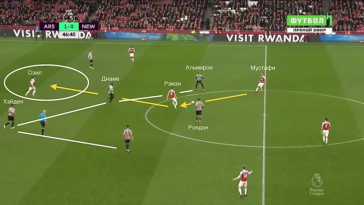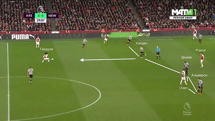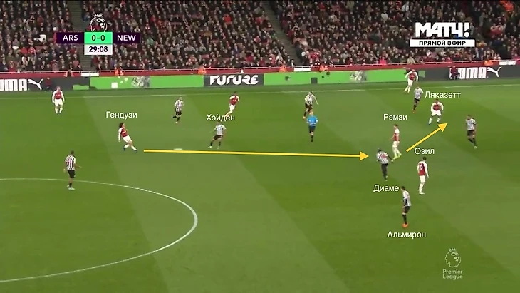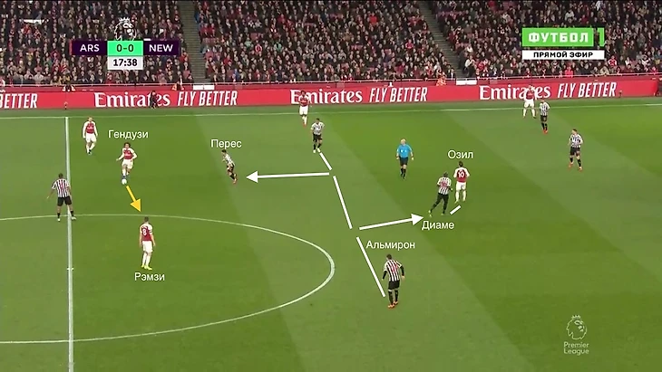 Гендузи с мячом, на него выдвигается Хэйден. Рэмзи остался один между линиями, а Диаме и Альмирон сфокусированы на Озиле.