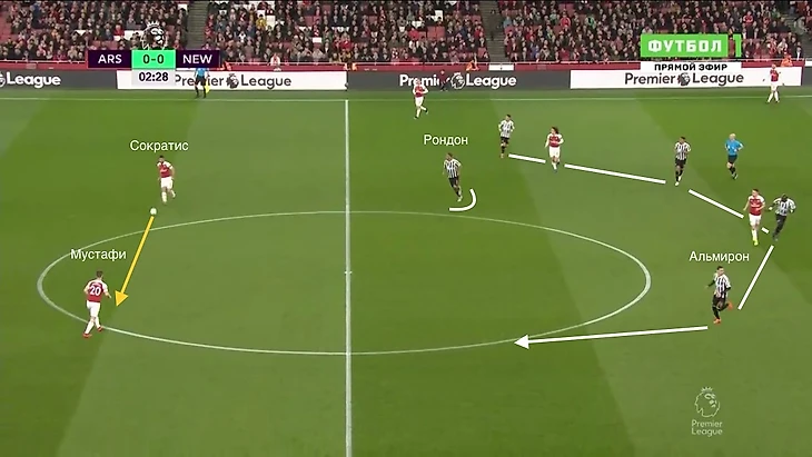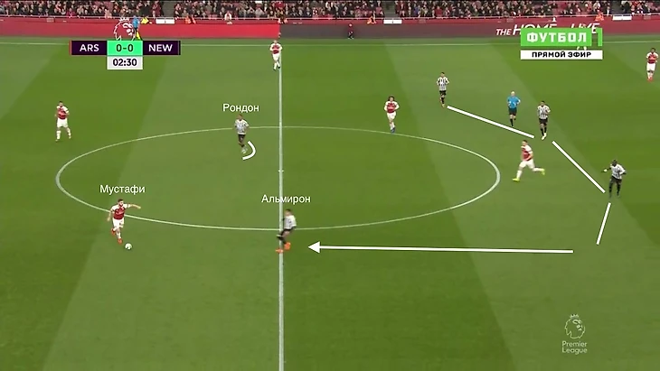 Ньюкасл в схеме, но Альмирон готов выдернуться на получающего мяч Мустафи.