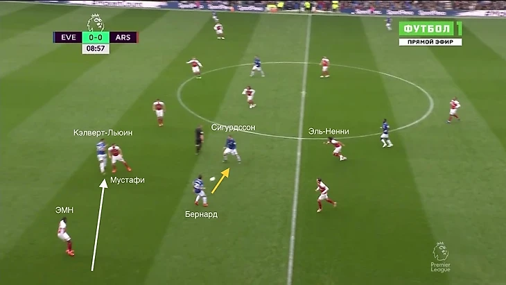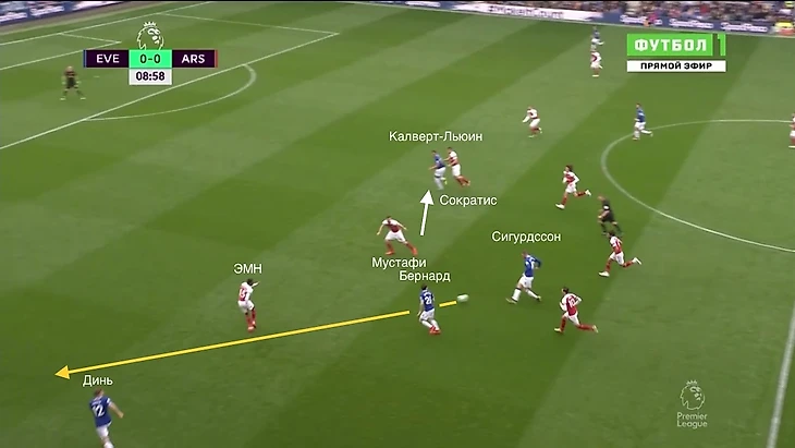 Сигурдссон находит свободного Диня, Калверт-Льюин еще отходит в центр.