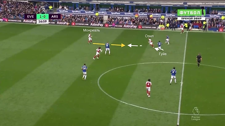 Озил опустился ниже и создал Мустафи вариант для паса, но за ним выдвинулся Гуйе.