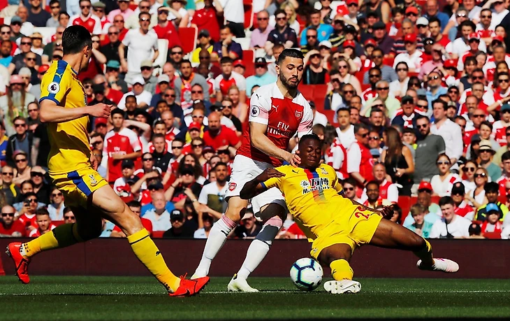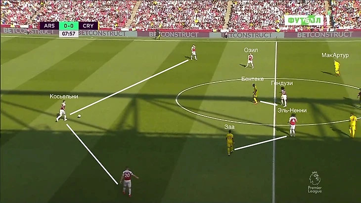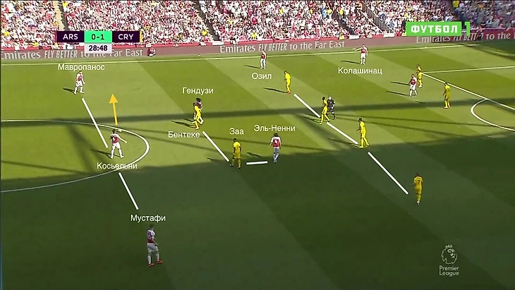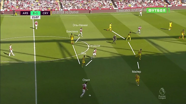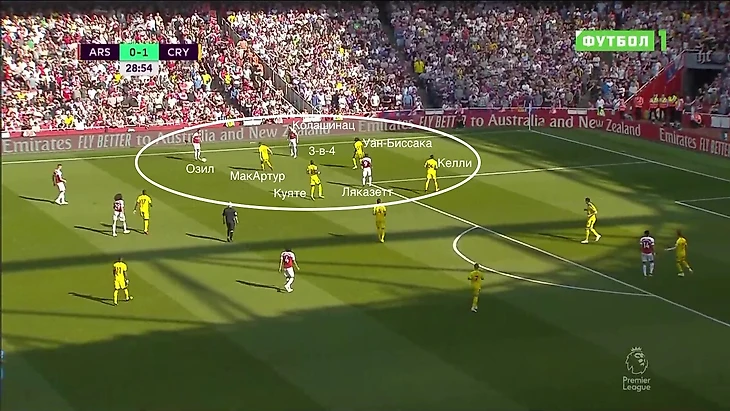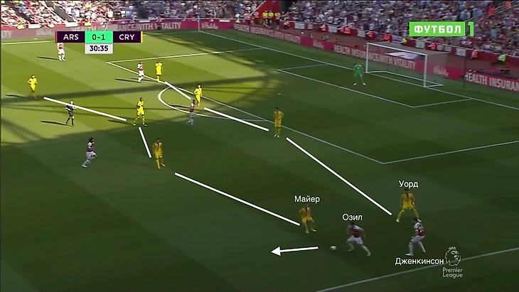 "Кристал Пэлас" оборонялся настолько компактно, что пространства между линиями практически не было. Так как с опорными полузащитниками "Арсенала" играли нападающие, пара центральных полузащитников могла спокойно контролировать одного Месута, а центральные защитники при этом могли подстраховать.