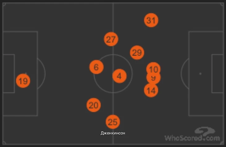 Англичанин вообще провел плохой матч. Всего 18 передач за первый тайм, когда у Колашинаца 46, ошибки при приеме и в передачах, низкая средняя позиция. Сложно сказать, что в этом случае причина, а что следствие, но низкая вовлеченность Карла в игру – это факт.