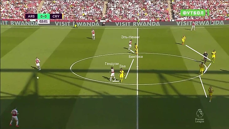 "Кристал Пэлас" оборонялся в 4-4-2, где первая линия – Бентеке и Заа играли с опорными полузащитниками Арсенала, опекая их или перекрывая направление передачи.