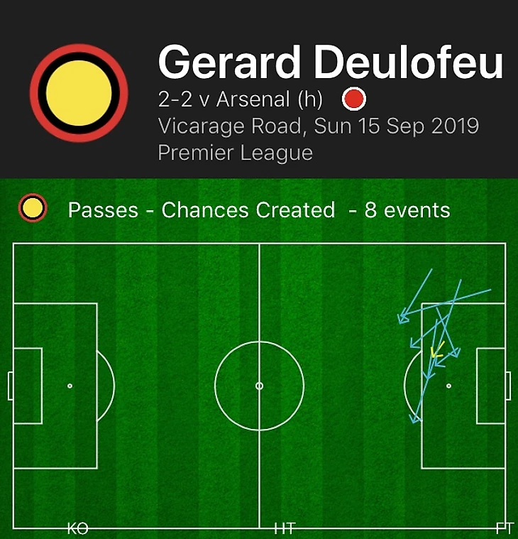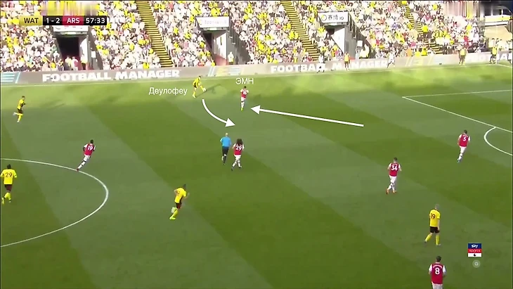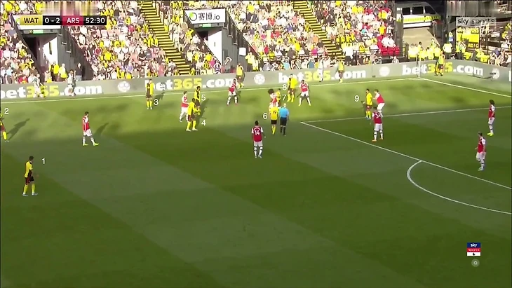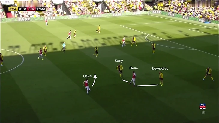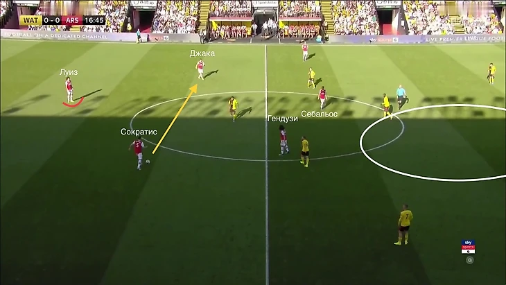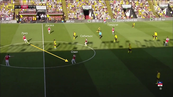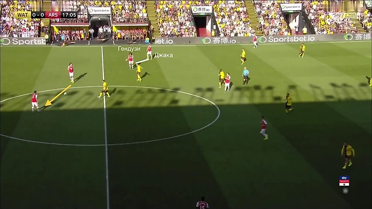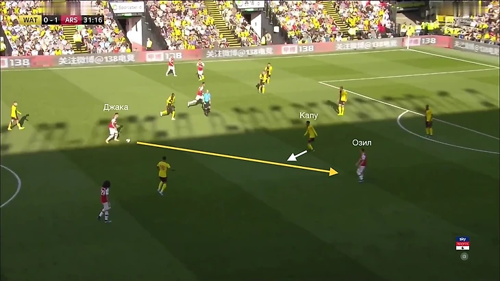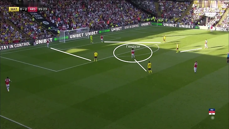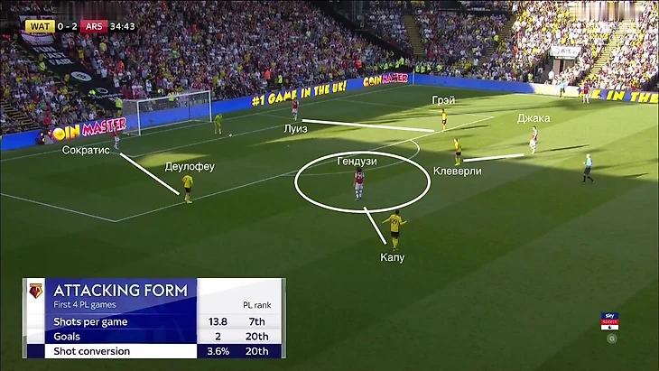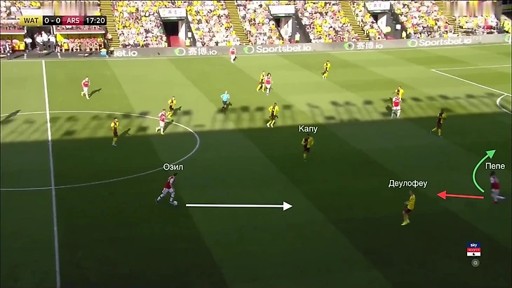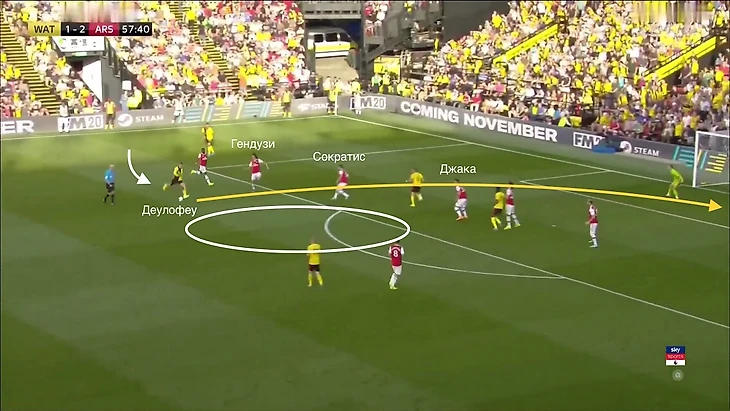 Испанец смещается в центр. Гендузи ушел за забежавшим игроком "Уотфорда", а Джака непонятно зачем ушел в центр штрафной. В итоге Деулофеу спокойно бьет без сопротивления.