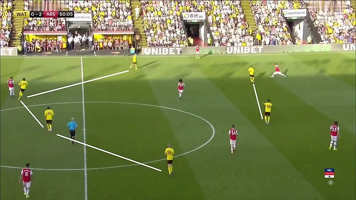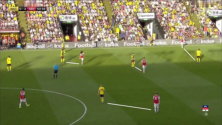 Прессинговал "Уотфорд" только при розыгрышах от ворот, причем делал это хитро. Кике Санчес сохранил прежнюю структуру прессинга и удачно попал в схему "Арсенала", хотя готовился явно к 4-2-3-1 (гости хоть и играли с ромбом в центре, но для розыгрыша от ворот оставались только Джака и Гендузи, Себальос уходил выше к Озилу). В первой линии располагались Деулофеу и Грэй, во второй Капу и Клеверли, Хьюз же уходил ниже к Каборе. Но самое главное, что Флорес выбрал Гендузи мишенью для прессинга, и в итоге эта идея сработает.