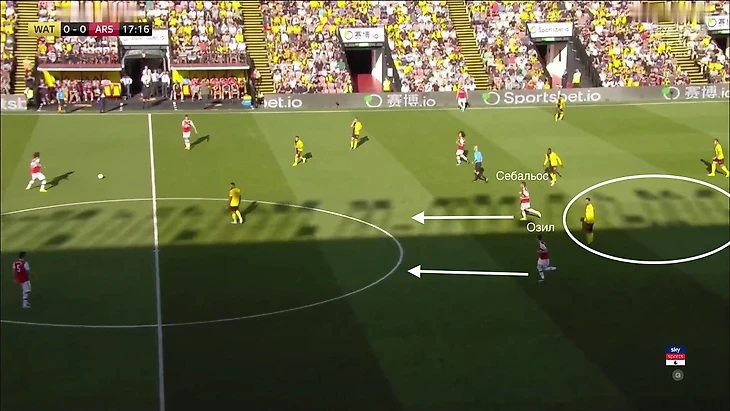 Озил и Себальос синхронно ушли в одном направлении, хотя таким образом они оставляют опорную зону.
