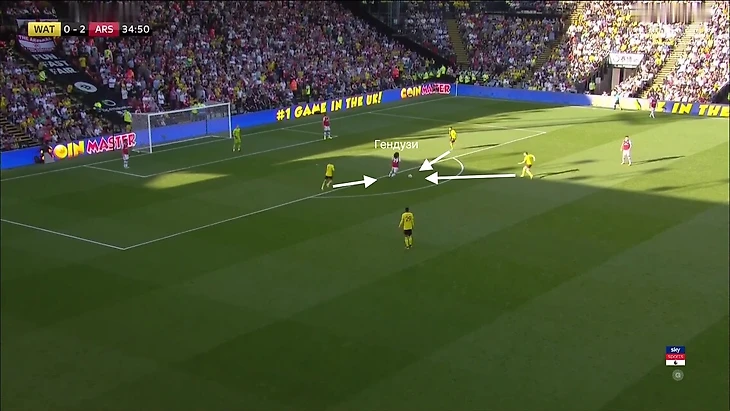 Лено отдает на "свободного" Гендузи и француза легко зажимают. В итоге он потеряет мяч, а у "Уотфорда" будет момент.