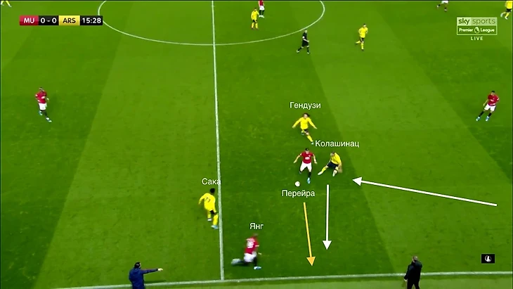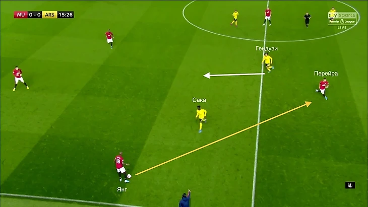 "Юнайтед" попробовал взломать фланг, за счет того, что Гендузи не успеет переключиться на Перейру, но помог Колашинац. Сначала он успел помешать бразильцу, а потом и в подкате выбил мяч у Янга.