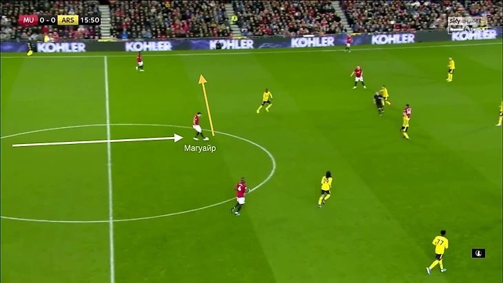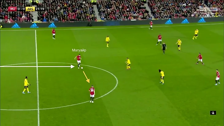 Магуайр совершенно без сопротивления сам потащил вперед, но в итоге выбрал довольно простой и не сильно продвигающий мяч пас на фланг.