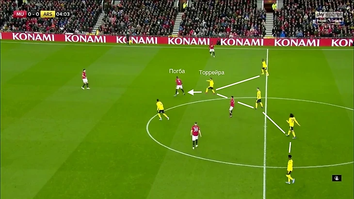 Продолжение эпизода с выдвижением Торрейры, аргентинец задержался выше, а у Погба сразу три варианта для паса.