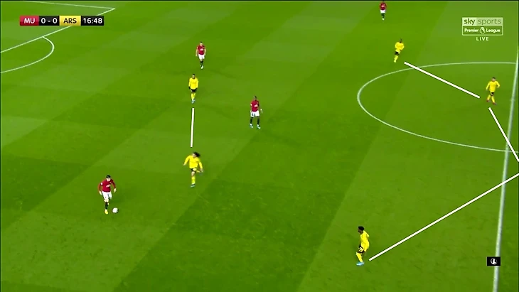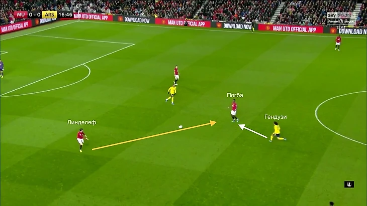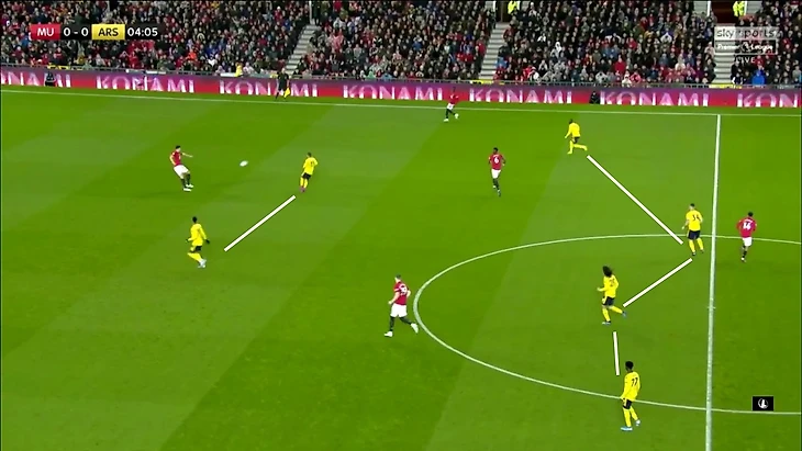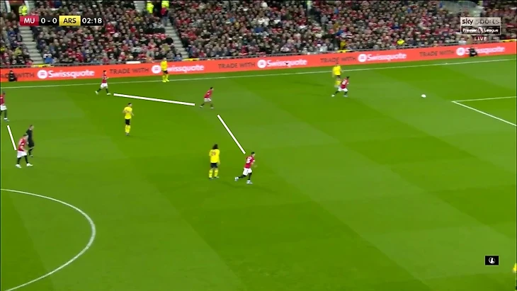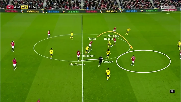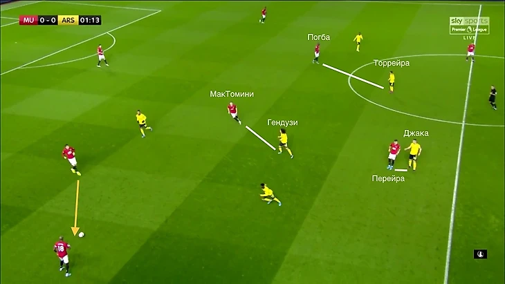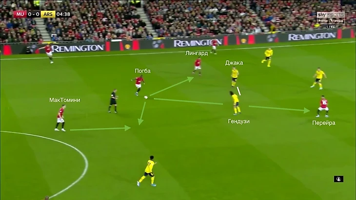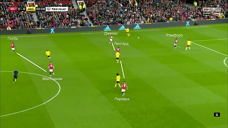 В прессинг на вратаря выдвигался не только Рэшфорд, в зависимости от ситуации это могли быть и Джеймс, и Лингард. Это вносило небольшой хаос в структуру и могло быть уязвимым местом прессинга, но в целом "Арсенал" этим не пользовался. "Юнайтед" неплохо останавливал попытки гостей подержать мяч в первом тайме.