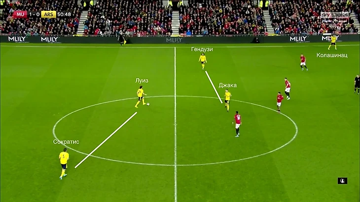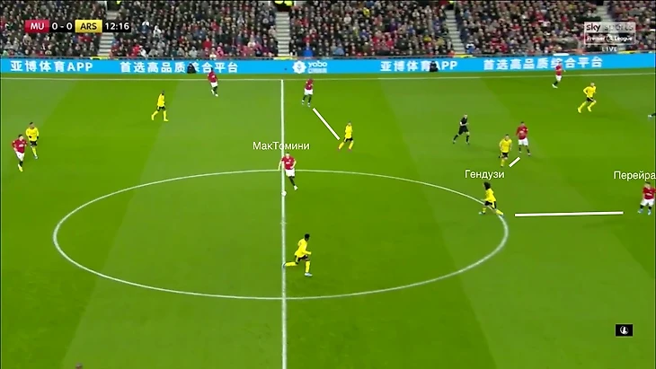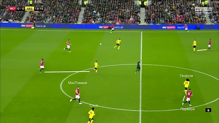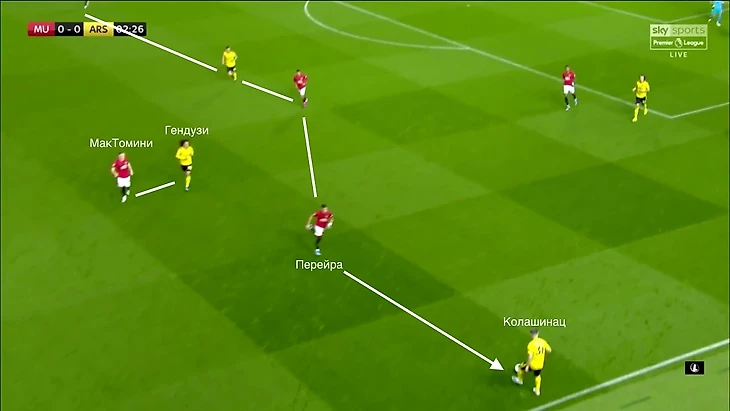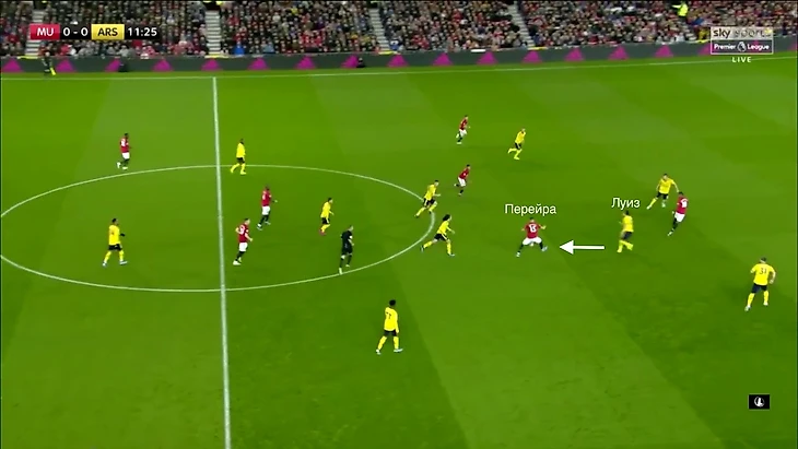 В общем, ничего серьезного из своего преимущества "МЮ" извлечь не смог. В каких-то эпизодах "Арсеналу" просто везло, но чаще всего гости сами неплохо оборонялись и действовали в подстраховке. С Перейрой Гендузи помогали справиться Луиз, Колашинац и Сака (который в принципе провел отличный матч, и с точки зрения обороны тоже), опекая или выдвигаясь на бразильца в зависимости от ситуации. А когда подстраховки не было, француз совершенно правильно расставлял приоритеты между Перейрой и МакТомини, давая свободу только второму.