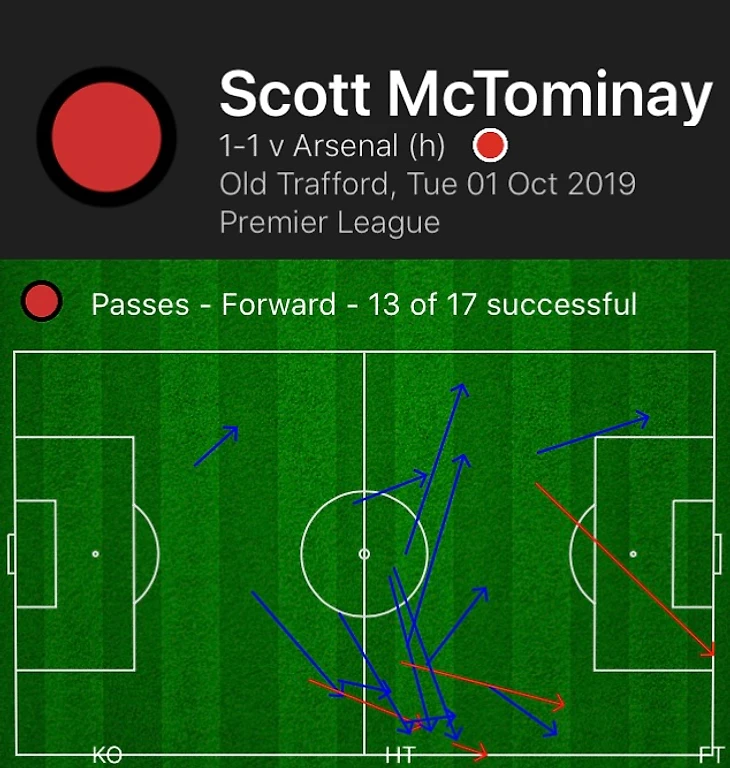 Так "Арсенал" перекрывал наиболее креативных полузащитников "МЮ", а шотландец оставался свободным, все же он довольно консервативен на мяче. Шотландец был хорош в матче, но продвигал мяч все равно только на дрибблинге. С этого он заработал несколько штрафных, но это не сравнится с пользой, которую он мог принести команде играя чуть острее с мячом. Даже получая немного больше свободы, чем Погба, он сделал меньше передач вперед, и его передачи, в целом, более осторожные: