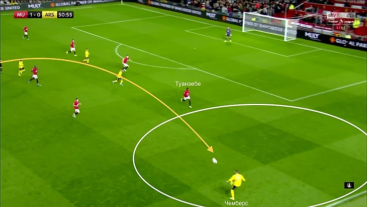 Чемберс тоже в высокой и широкой позиции, Туанзебе вынужден выдвинуться на Калума, из-за чего упускает Обамеянга за спиной.