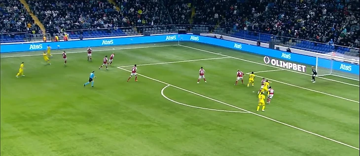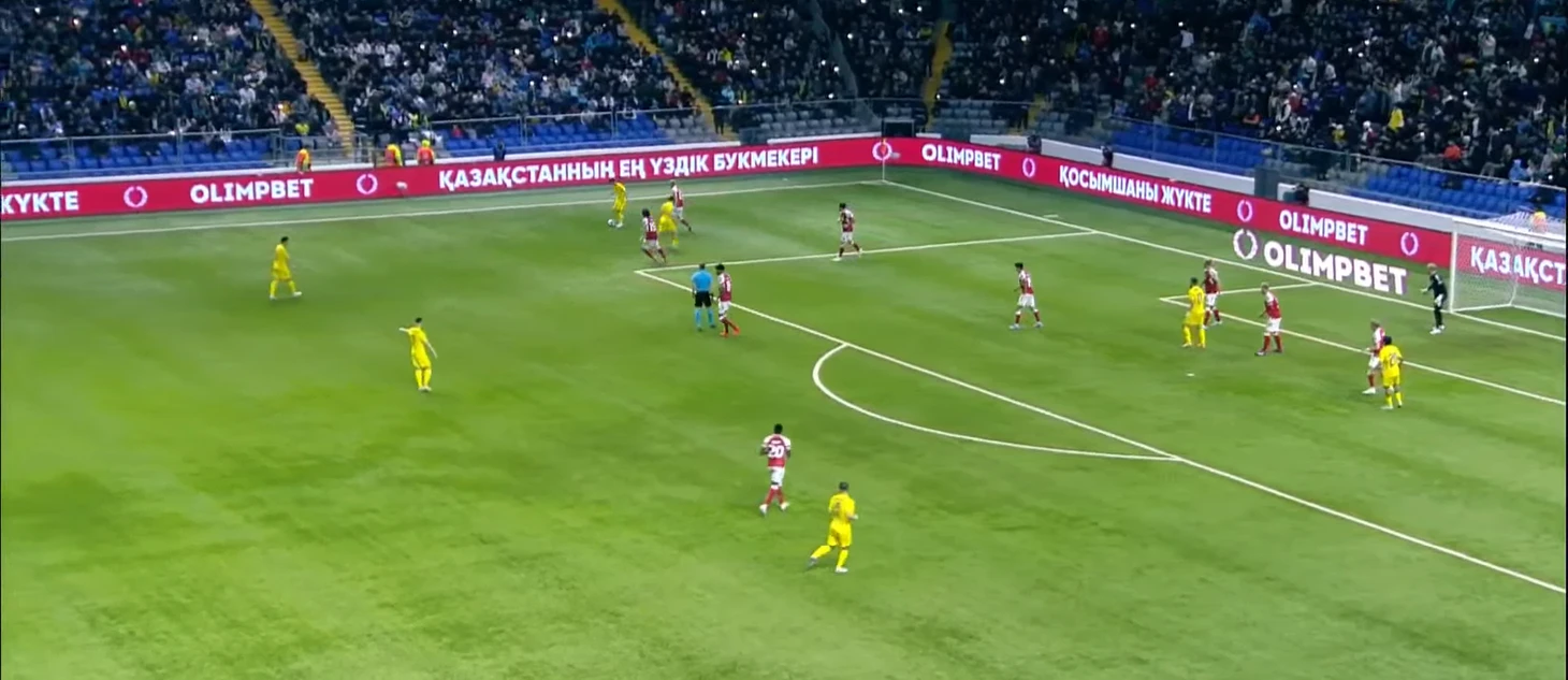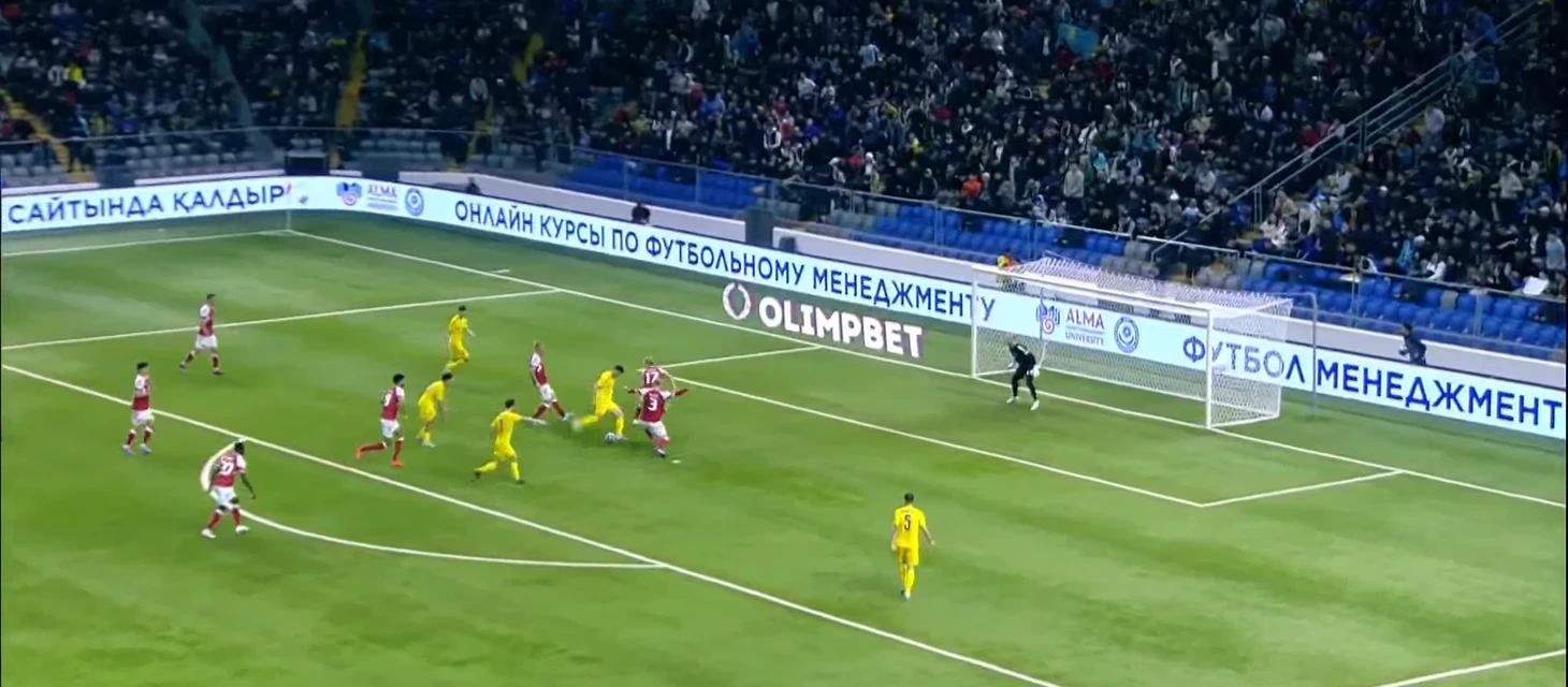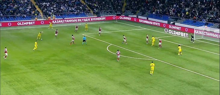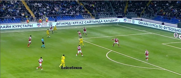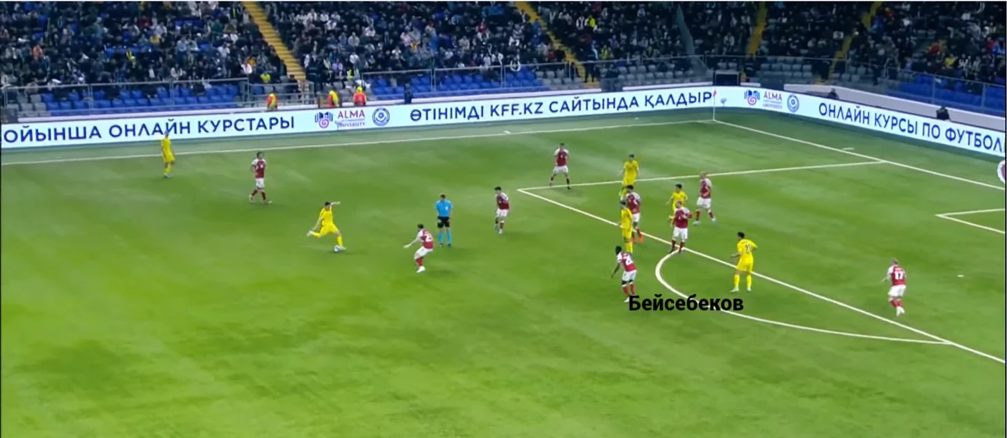 На 70-й минуте с перехвата Марочкина (лучший результат в команде) началась наша позиционная атака. Все игроки группы атаки расположились на левом фланге и это замечает Бейсебеков, который открылся у штрафной и отрезающим пасом между центральными защитниками Тагыберген выводит Бейсебекова на удар, который отбил Шмейхель.