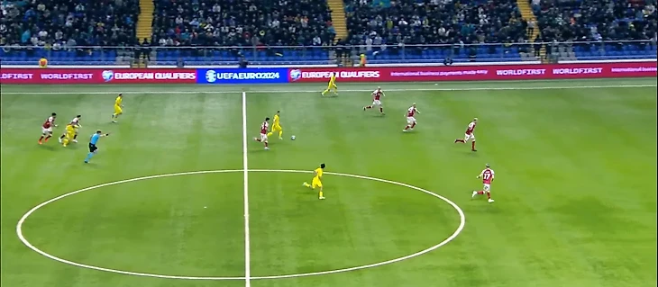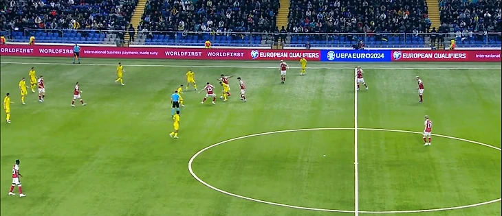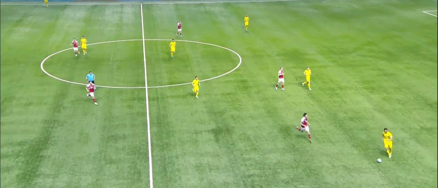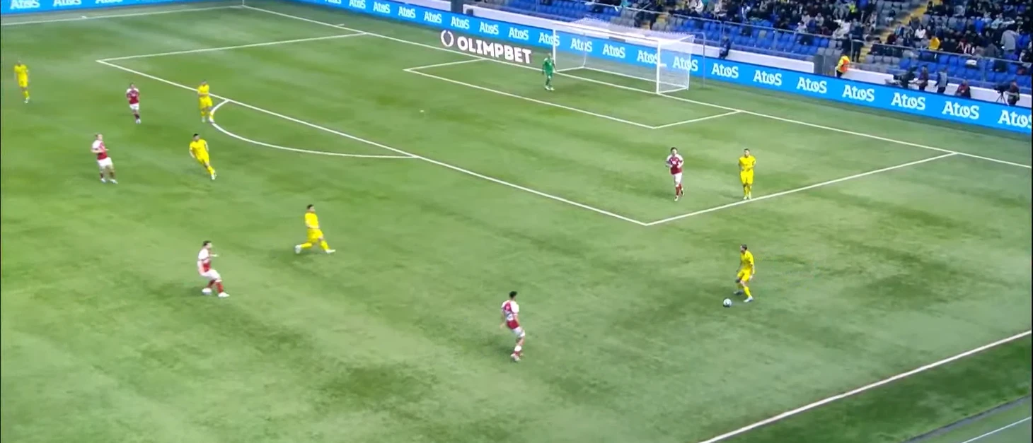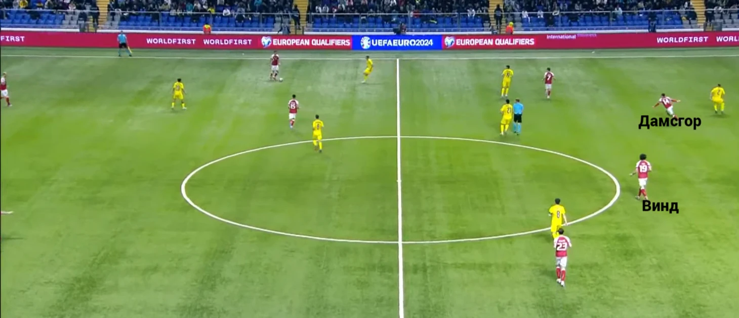 В первом тайме наша сборная как мне показалось уже играла не так активно, как в первом тайме против Словении. Как мне кажется это связано с тренерской установкой поиграть в экономном режиме, чтобы хватило на весь матч, потому что Адиев после Словении отмечал что после 65 минуты силенок не хватало. Тем не менее пару раз мы пытались контр-прессингом накрывать гостей и пару раз убегали в контр-атаку. В одной из таких атак Самородов накрутил нескольких игроков Дании и отдал пас на забегающего Габышева, который в этом моменте получил травму. Возможно это был рецидив, потому что Адиев сказал что Габышев и Малый выходили на матч с определенными проблемами со здоровьем. Вместо Габышев появился дебютант Лев Скворцов, место Малого после перерыва занял Ерланов.