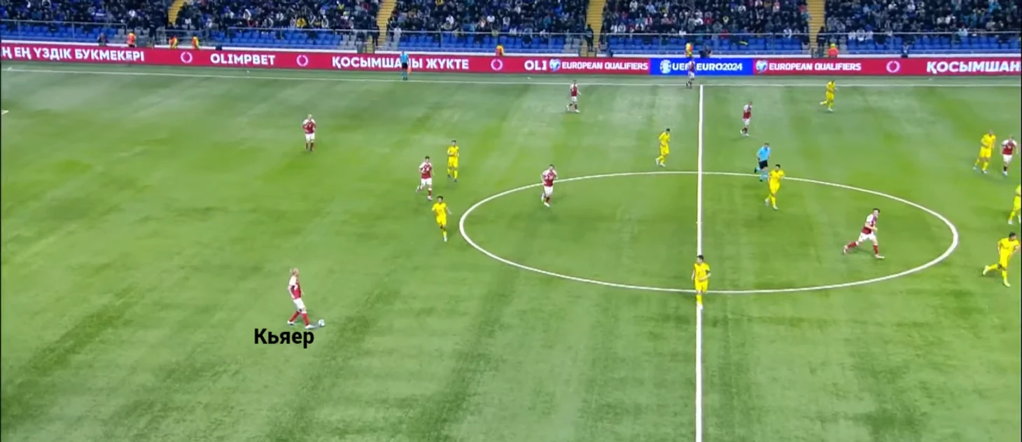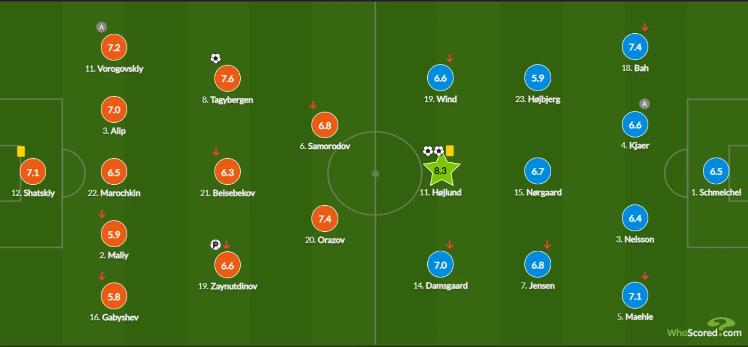 Во втором тайме мы уже действовали смелее в прессинге, так как отступать уже было никуда. После перерыва освежился правый фланг защиты, как я уже писал ранее. Скворцов и Ерланов добавили быстроты и здорово отыгрывали в обороне. Скворцов за 60 минут игрового времени совершил 4 отбора, 1 перехват, выиграл 7 единоборств (лучший результат в команде). На это Юльманн (главный тренер Дании) ответил тройной тройной заменой на левом фланге, то есть он полностью поменял свой левый фланг, можно сказать что замены здорово усилили нашу игру.