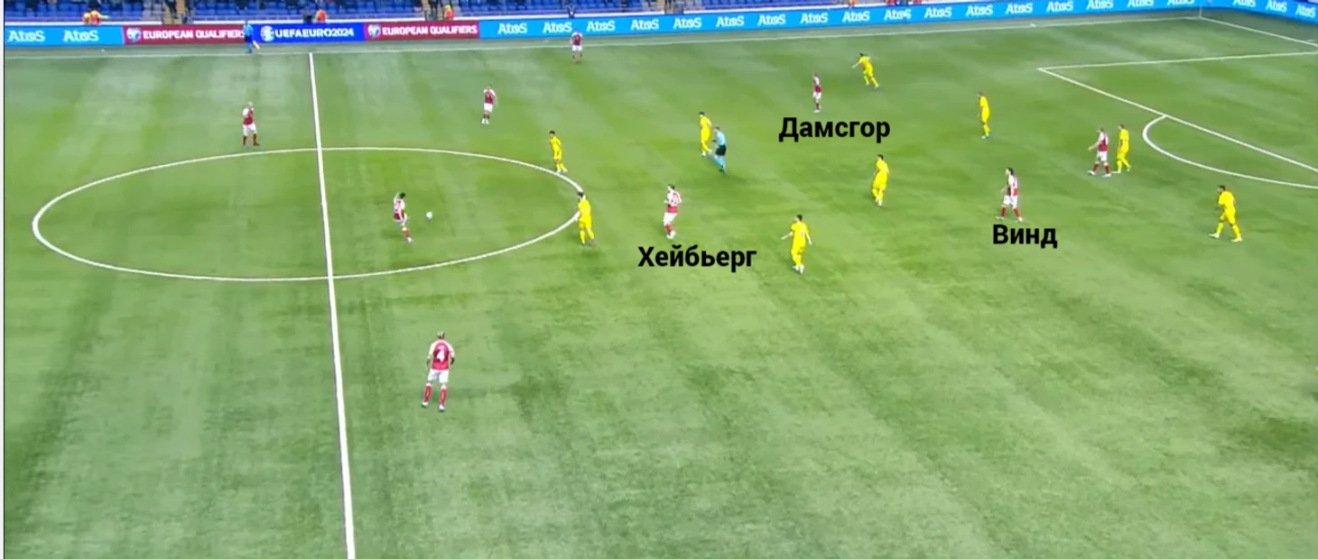 Крайние нападающие Винд и Дамсгор располагались узко в полу-флангах, открываясь между линиями спиной к воротам крайние защитники датчан поднимались высоко и создавали ширину на флангах, полузащитники же помогали создавать комбинации, либо забегали за спину защитникам. В основном забегал левый центральный полузащитник Йенсен, а Хейберг же искал пространства между линиями и всегда двигался к мячу, либо опускался вниз начиная атаки первым пасом.