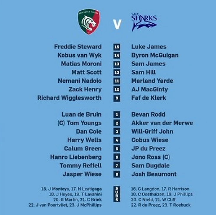 Итак, перехожу плавно к матчам и начну с матча, в котором Лестер Тайгерс принимали Сэйл Шаркс. В этом матче было несколько сюжетных линий, например дебют главного тренера Сэйл Шаркс Алекса Сандерсона, 200-й матч капитана Лестера Бэна Янгса (2 номер), противостояние братьев Визе, старший Яспер (8 номер) игрок Лестера, а младший Кобус (4 номер) игрок Сэйл Шаркс, а также 150-й матч за Сэйл Шаркс у Сэма Джэймса (13 номер),