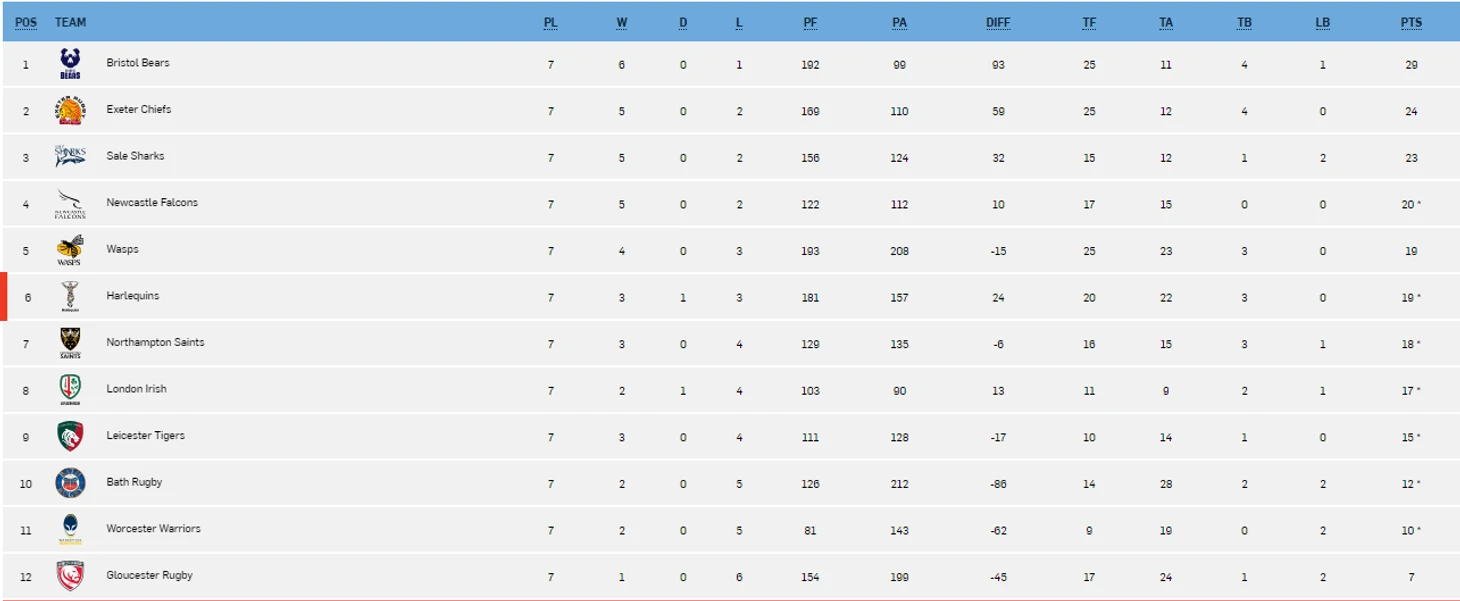 *Отмененный матч. Вустер Уорриорз 4 очка, Арлекинс 2 очка.