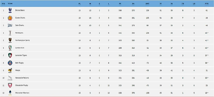 *Отмененный матч. Вустер Уорриорз 4 очка, Арлекинс 2 очка (5 тур)