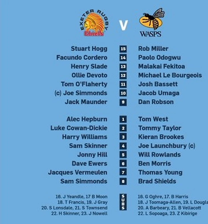 Субботний день начнётся на Сэнди Парк встречей седлу Эксетер Чифс(2) и Уоспс(9).
