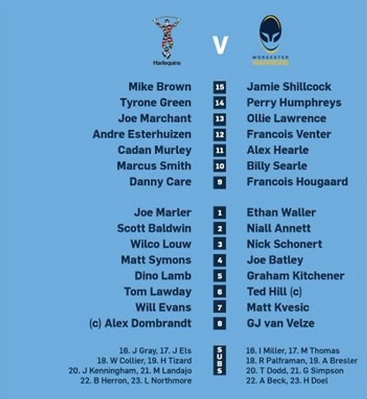 Клубы должны были сыграть на Новый Год, но матч был отменён, и победу присудили Вустер Уорриорз. Вустер всего один раз проиграл Арлекинс в Премьершипе с 2017 года: в феврале 2019 года со счетом 33-47.
