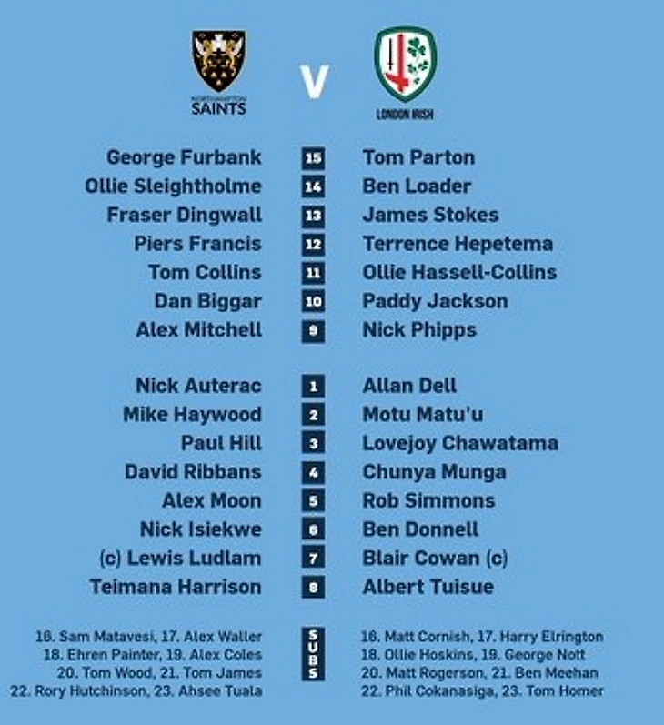 А теперь о предстоящих матчах 16-го тура. И первыми сыграют в туре Нортхэмптон Сайнтс(5) Лондон Айриш(6) на Фрэнклин’с Гарденс.