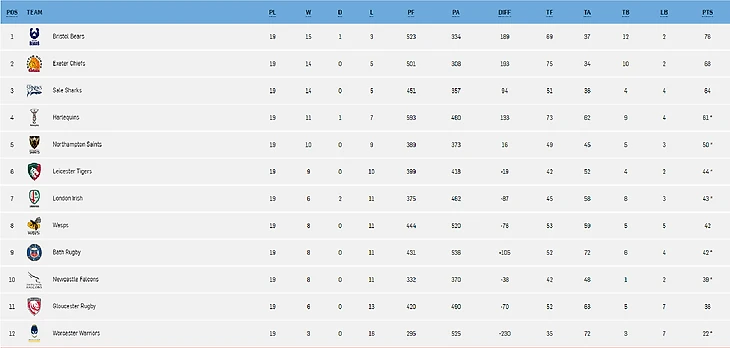 *Отмененный матч. Вустер Уорриорз 4 очка, Ньюкасл Фалконс 2 очка(10 тур).