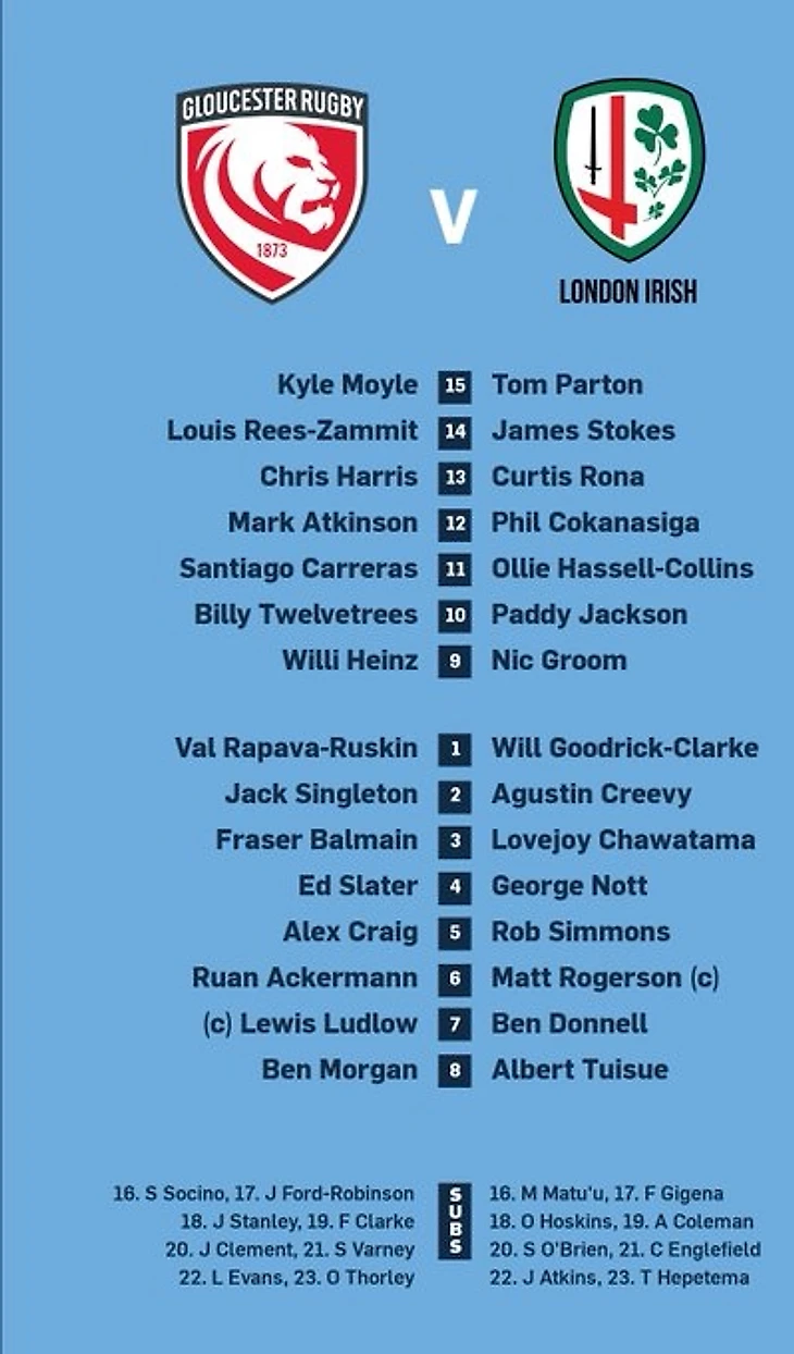 Вилли Хайнц проведёт юбилейный сотый матч за Глостер. А у Айриш может дебютировать в этом сезоне Каолан Энглфилд.