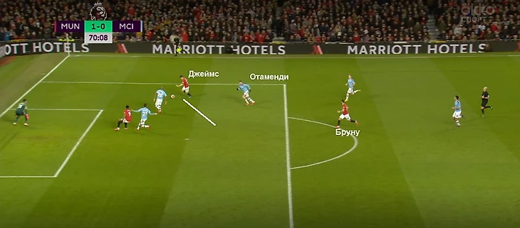 На 70 минуте у игроков МЮ получился очень крутой выход в контратаку через правый фланг Джеймса. Ван-Биссака после очередного отбора мяча – в этот раз у Мареза – дает сильную передачу вдоль бровки на Дэниела. Тот принимает мяч и начинает смещаться в центр, находясь под присмотром Отаменди.