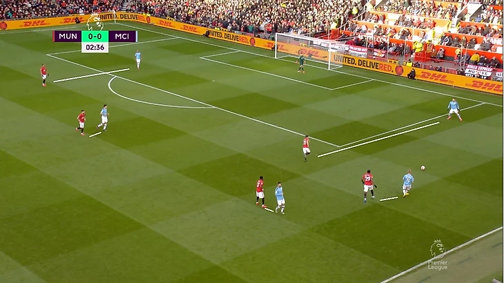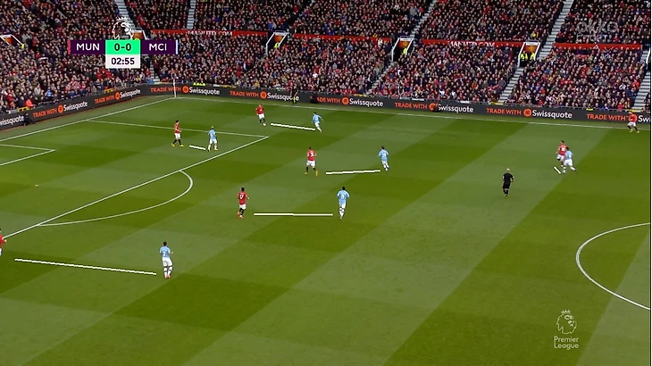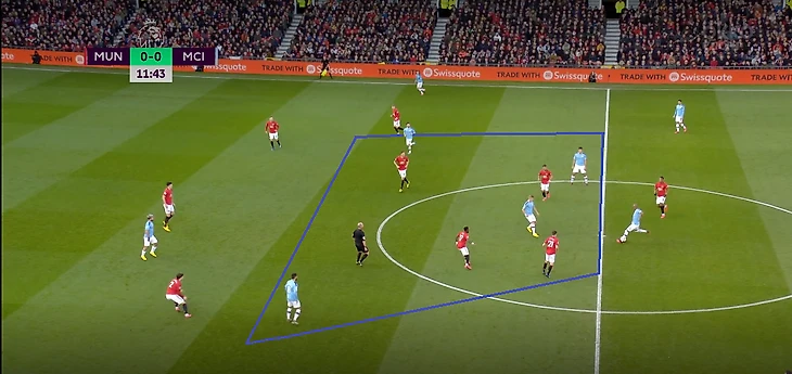 Затем баланс немного сместился в сторону "Сити", и они начали контролировать мяч, при этом пытаясь выстроить позиционную атаку. "МЮ" довольно глубоко опустились на свою половину поля, тем самым насытив центральную зону, чтобы "горожанам" было сложнее двигать мяч в этом пространстве. «Сити» приходилось задействовать фланги для растягивания плотной обороны соперника. "Красные" в защитной фазе оборонялись ситуативно по схеме 5-3-2, либо 5-2-3.