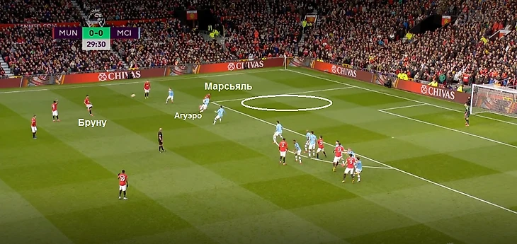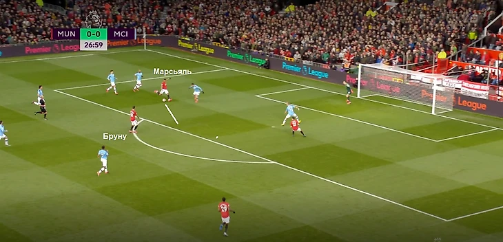 На 28 минуте Марсьяль мог создать момент куда опаснее, чем он получился в итоге. Если бы бросил взгляд и увидел подключающегося Бруну, то мог бы скинуть ему под удар. А ведь мы знаем, что у Фернандеша с ударом все в порядке.