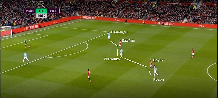 Лично для меня стало интересным, как Гвардиола решил использовать Зинченко. Когда мячом владел "Сити", Александр с левого фланга обороны смещался в опорную зону к Родри, тем самым разгружая его от опеки со стороны Фернандеша. В итоге складывалась преимущество 2 в 1, и Бруну уже не мог разорваться на двух игроков. К нему на помощь спускался ниже Джеймс, тем самым освобождался от давления Отаменди. Далее на фото пример из второго тайма.