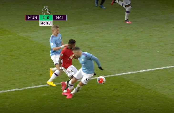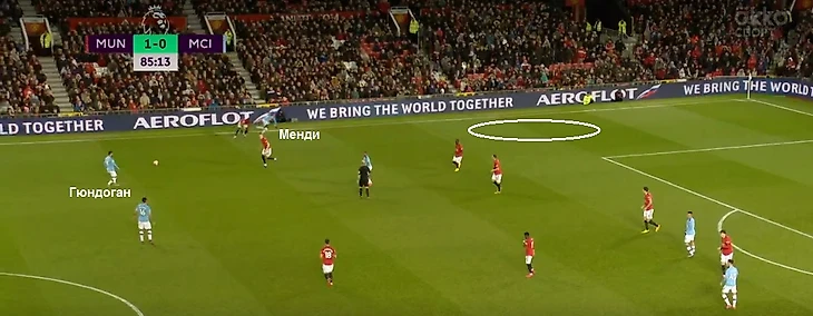 К тому же за счет подключения Зинченко в линию полузащиты, уравнивалось количество игроков "Сити" и "МЮ" в центре поля - 4 в 4. На фото пример из первого тайма.