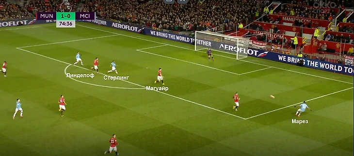 Далее, на 75 минуте, невероятно голевой момент был у Стерлинга. В этот раз был задействован правый, не такой активный, фланг "Сити". Канселу отдал отличную проникающую передачу на Мареза. Тот в гордом одиночестве догоняет мяч и простреливает в штрафную площадь "МЮ". Линделоф не успевал за Стерлингом, а Магуайр не контролировал пространство между собой и Рахимом. Нападающий "Сити" пытается в падении нанести удар по мячу, но круглый лишь проскальзывает по левой ноге Стерлинга. Упущен, наверное, самый голевой момент «горожан».