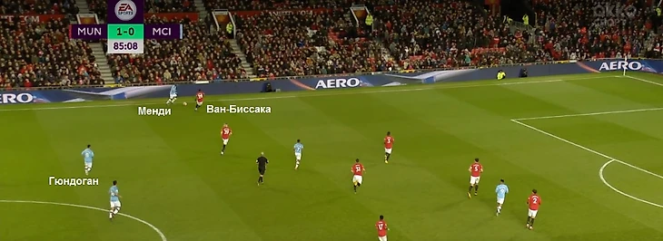 В последние 10-15 минуте "Сити" продолжал давить на оборонительные построения "Манчестер Юнайтед", но здорово действовала защита «красных». «Горожане», в свою очередь, хоть и заигрывали мяч в центре, но продвинуть его в опасные зоны не могли. Единственное, срабатывало выдергивание на себя флангового защитника - как это сделал Менди на 86 минуте с Ван-Биссакой. Отдал пас на Гюндогана, и тут же побежал в освободившееся пространство за спиной для дальнейшего прострела в штрафную площадь. Но тут уже прострел не получился опасным.