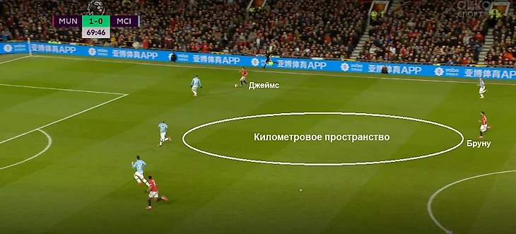 Когда пошел заброс на Джеймса, Бруну заметил километровое пространство в центре поля, которым он в итоге воспользовался для забега. Его даже никто не контролировал из игроков "Сити". Но Джеймс зачем то решил пойти обыгрывать Отаменди после чего пробить по воротам.