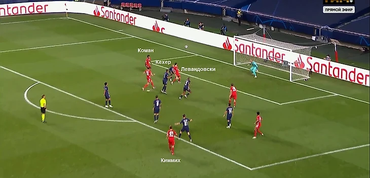 В этот момент Коман вбегает в штрафную, и далее на дальнюю штангу. Его при этом держит Керер. Казалось бы контролирует, но нет. Керер играет по мячу, забывая о Комане, и думая, видимо, что навес пойдет на Левандовского, так как подбежал к нему ближе со спины. В итоге Кингсли остается фактически без сопротивления и борьбы. Киммих делает мягкий заброс на дальнюю штангу, где стоит Коман, и последний головой замыкает передачу – 0:1.