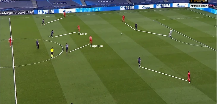 В данном эпизоде пас идет на Тьяго. Он скинет на Горецку, который под давлением Эрреры решит сделать пас на Киммиха, но он получится настолько в недодачу, что Мбаппе спокойно перехватит его. Возможно, Горецка поздно заметил то, что Киммих уже практически закрыт для передачи, и поэтому пас получился настолько сомнительным. Тем не менее, давление «ПСЖ» работало.