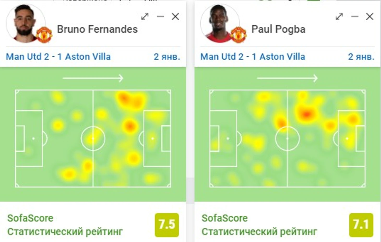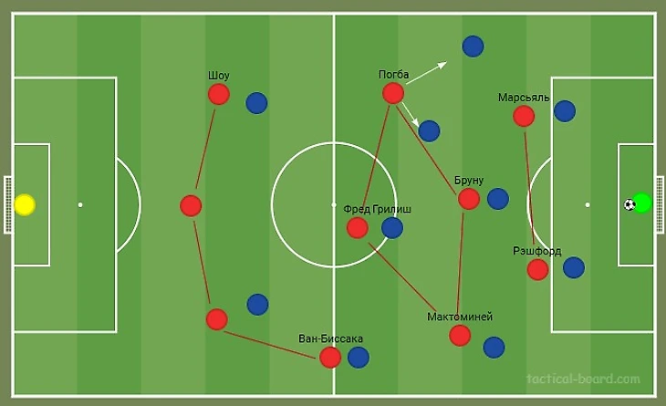 Стоит обратить внимание на взаимозаменяемость позициями между Погба и Бруну. В случае с первым голом «красных» француз играл на позиции под нападающим, а португалец сместился на левый фланг. Здесь свою роль сыграл рост Погба, так как ему удалось выиграть верховое единоборство и сбросить мяч на своего товарища по команде. Тем самым атака продолжилась и закончилась результативным взятием ворот. Кроме этого, у француза была возможность забить гол, когда тот находился в штрафной площади и замкнул передачу с левого фланга, но мимо ворот.
