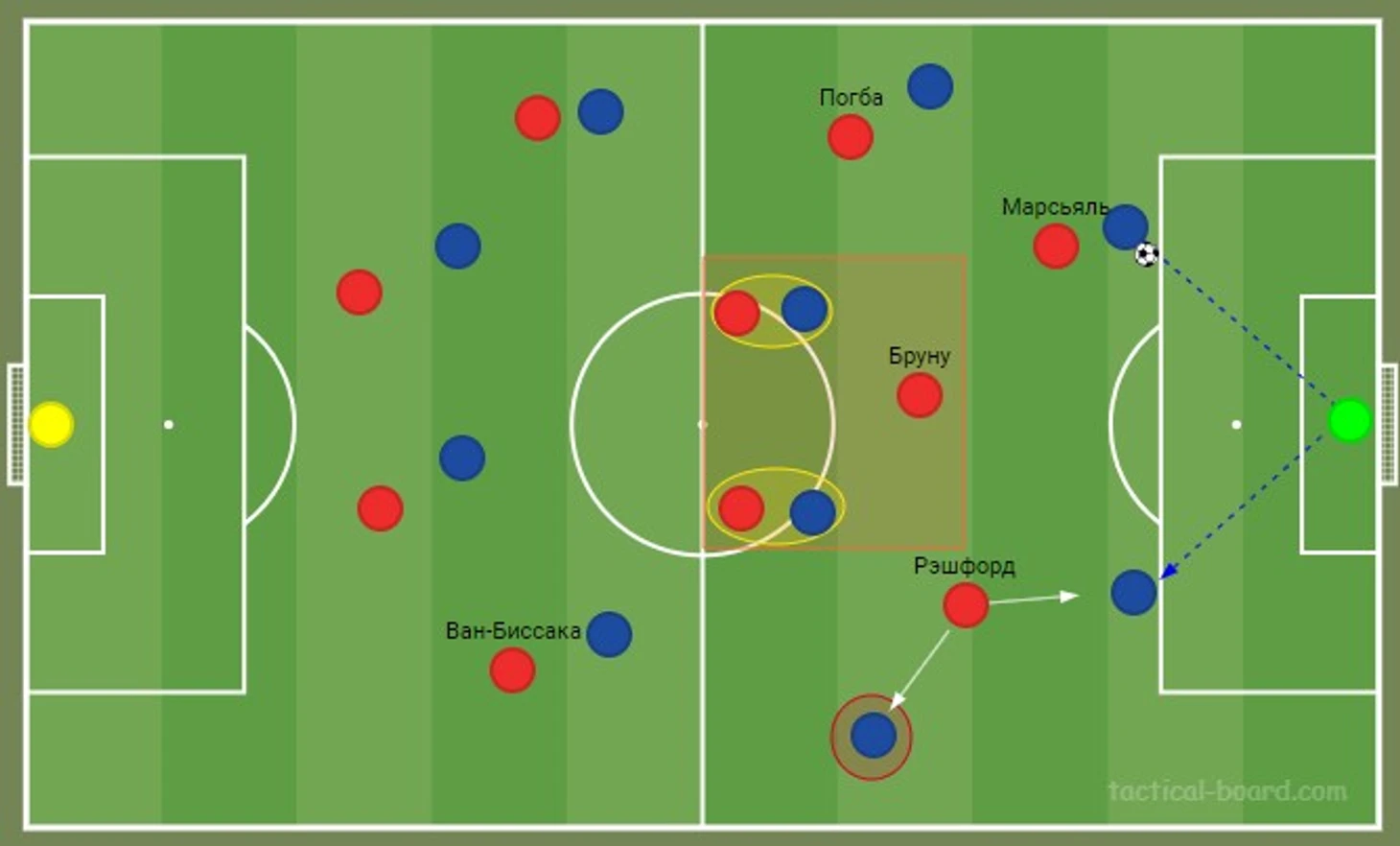 На схеме расположения игроков видно, что при прессинге у «Астон Виллы» остается свободен левый фланг обороны, куда потенциально можно перевести мяч. Если бы Рэшфорд одновременно поднимался высоко с Марсьялем, то крайний защитник мог спокойно принимать мяч в случае перевода на него. Поэтому Рэшфорд остается в полупозиции, что позволяет ему оказывать давление как на центрального защитника, так и на крайнего, если к ним пойдет передача.