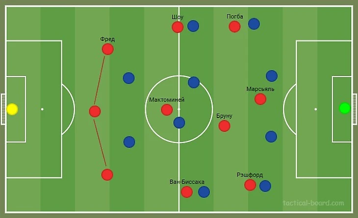 При прессинге со стороны «Астон Виллы» оборона «Манчестер Юнайтед» перестраивалась таким образом, что Фред смещался на позицию третьего центрального защитника. Мактоминей оставался один в опорной зоне. Такое перестроение позволяло крайним защитникам подниматься выше по флангам. Они уводили за собой крайних полузащитников. Получалось численное превосходство в обороне, против двух игроков «Астон Виллы». Мактоминей и Фред отвечали за подстраховку зон крайних защитников при потере мяча. Кроме этого, благодаря перестроению открывалось пространство для Бруну на половине поля соперника, что освобождало его от опеки.