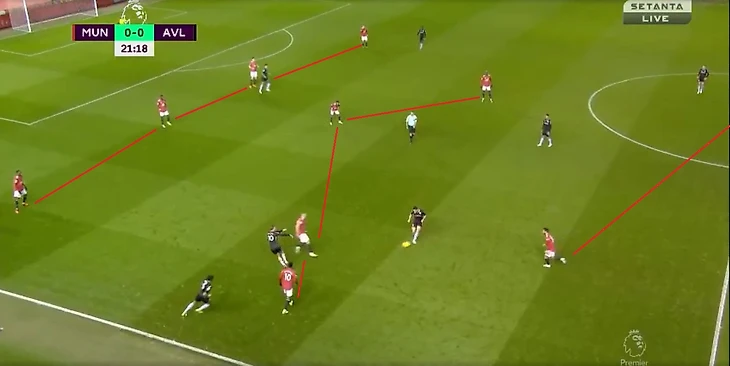 При розыгрыше «Астон Виллы» от ворот за крайнего защитника отвечал Мактоминей, который поднимался к нему выше на фланг. Фред оставался один в опорной зоне и играл персонально по Грилишу. Бруну отвечал за одного из опорников соперника, второго опекал Погба, при этом держал в поле зрения крайнего защитника. В данной расстановке уже можно было заметить ромб из четверки полузащитников «Манчестер Юнайтед».