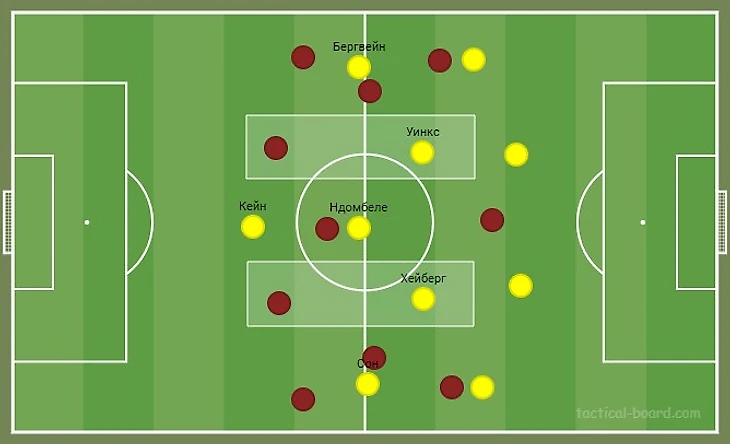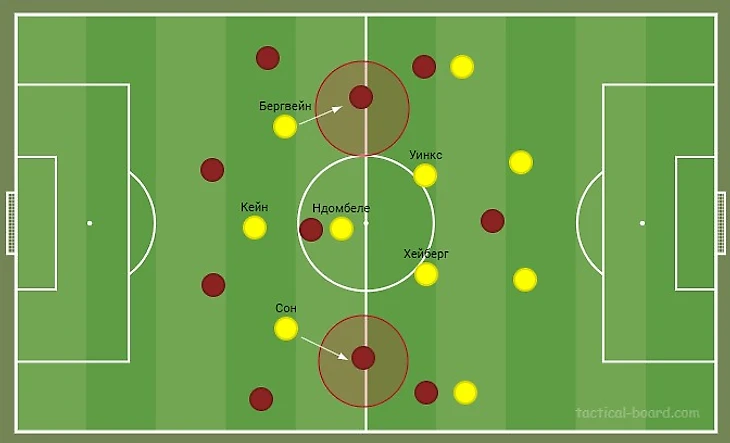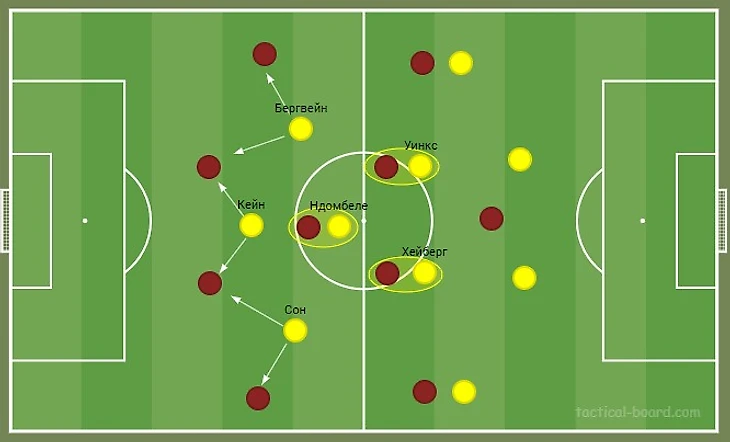 Соответственно, из-за того, что центр поля «Тоттенхэм» хорошо закрыл, сопернику было сложно продвигать мяч через эту область. Центральные полузащитники смещались во фланги потому, что там открывалось пространство из-за высокого расположения Сона и Бергвейна. Однако они оба успевали опускаться ниже, чтобы оказывать давление на игрока с мячом. Хейберг и Уинкс не могли оставлять опорную зону открытой, поэтому Сону и Бергвейну необходимо было опускаться ниже и отрабатывать в обороне на флангах.